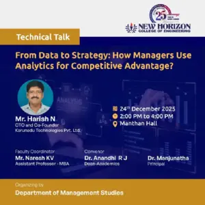 The Master of Business Administration program at New Horizon College of Engineering is a two year full time autonomous program affiliated to Visvesvaraya Technological University. It is a dual specialization program in the areas of marketing, finance, human resources, business analytics and operations.